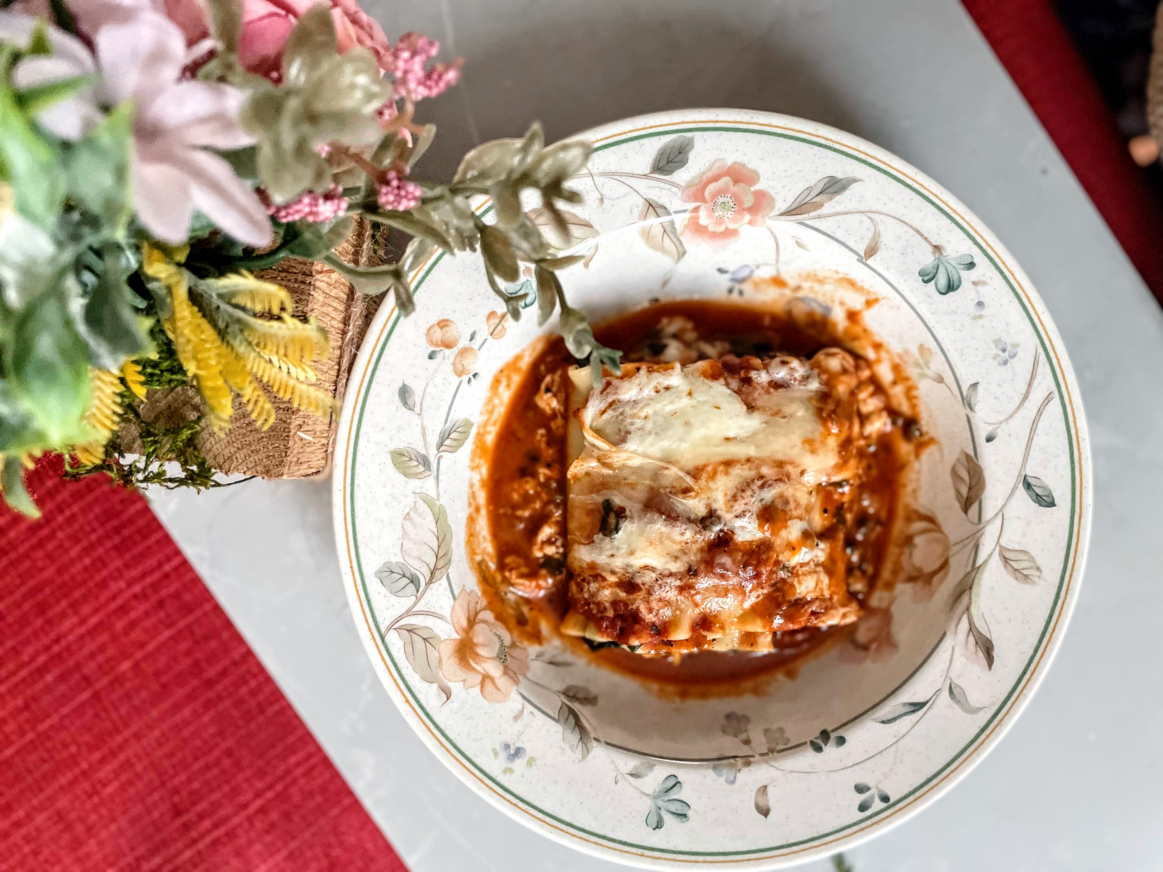Traditionally, lasagna actually originated from Greece. Italy adopted it overtime to make it their own where flat noodles are Northern Italian, and ruffled edged noodles are Southern Italian. While I can’t claim to make the OG, it’s fun to do variations on this classic. Instead of spending times doing stacks and layers, to save time – you can still roll it up and create the layering affect!